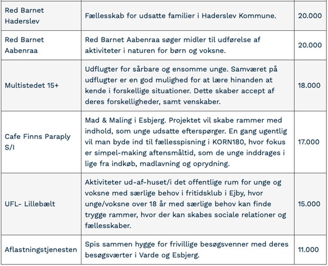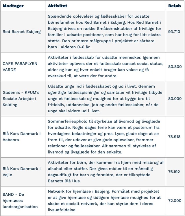 Den største donation var på 93.710 kr. til Red Barnet i Esbjerg og deres arbejde med at skabe spændende oplevelser og fællesskaber for udsatte børnefamilier og den mindste var til Aflastningstjenesten i Esbjerg og Varde som får 11.000 kr. til at arrangere middage med frivillige besøgsvenner og deres besøgsværter.