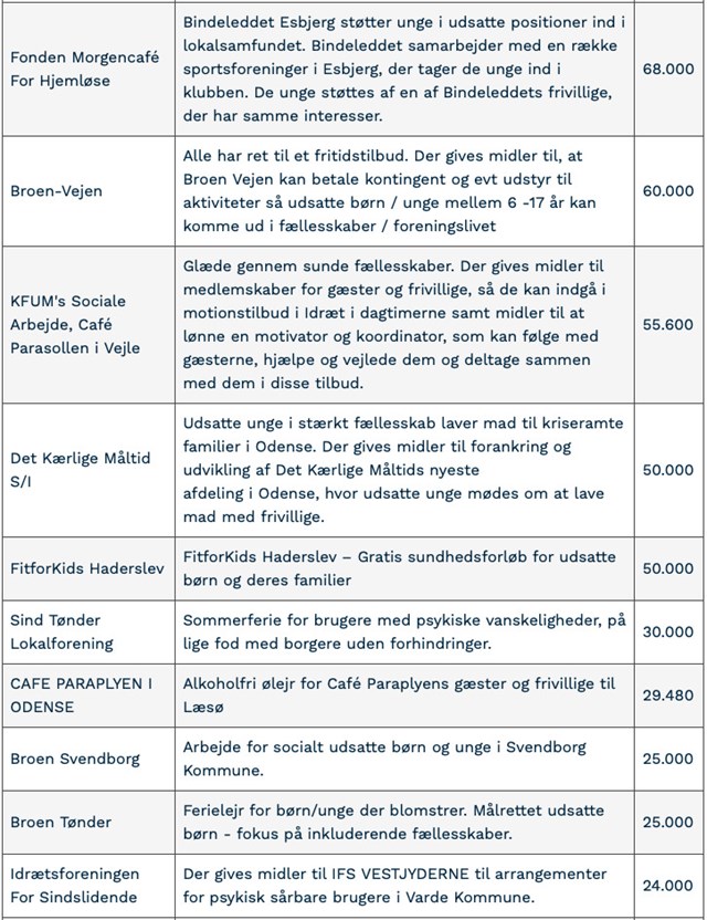 Der blev bl.a. også midler til Cafe Parasollen i Vejle, som fik 55.400 kr. til sit arbejde med mennesker i udsatte livspositioner, og til BROEN Svendborg, som fik 25.000 kr. til deres arbejde med børn og unge, der mangler midler til at komme til idræt.